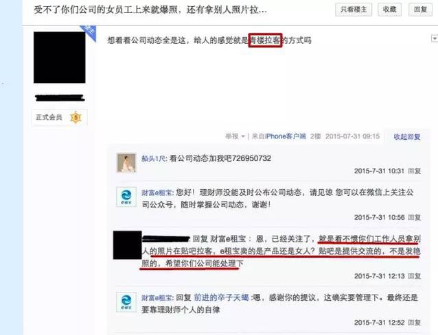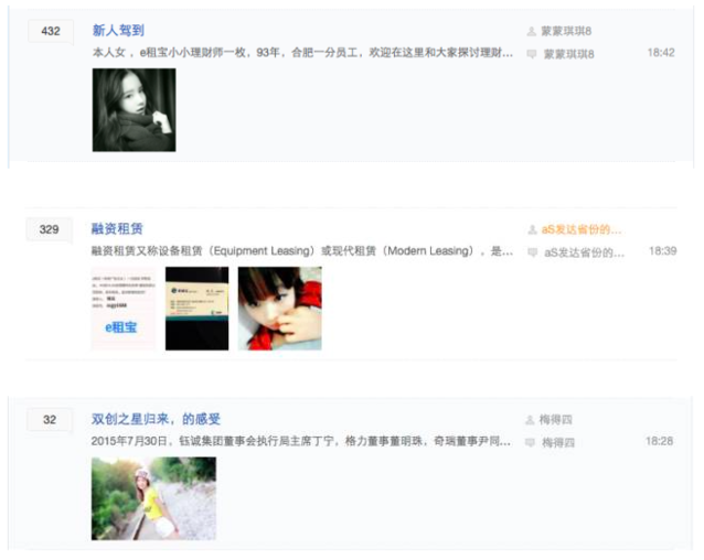 另外,鈺誠(chéng)團(tuán)體成立的人武部也被該員工稱為是鈺誠(chéng)彈壓上門討要工資員工的黑社會(huì)組織,鈺誠(chéng)的董事長(zhǎng)丁寧要下屬稱其為“丁主席”,稱總經(jīng)理魏引忠為“政委”。搜索百度百科,人武部即人民武裝部是我國(guó)在縣(旗,縣級(jí)市、市轄區(qū))、鄉(xiāng)(鎮(zhèn))和大中型廠礦、大專院校設(shè)立的軍事工作部分,企業(yè)中固然也有設(shè)立人武部的但都是國(guó)有大中型企業(yè),像鈺誠(chéng)團(tuán)體這樣的中外合資公司是否有資格成立人武部,相信良多人心中都會(huì)存有迷惑,但是當(dāng)時(shí)人武部成立揭牌典禮的時(shí)候,當(dāng)?shù)剀姺謪^(qū)領(lǐng)導(dǎo)、市區(qū)政府領(lǐng)導(dǎo)、人武部相關(guān)領(lǐng)導(dǎo)及全國(guó)多家媒體均有出席,還有良多報(bào)道稱之積極支持國(guó)防建設(shè)。 小插曲 打開e租寶的百度貼吧就可以看到一種與公司高大上不相符的氣質(zhì),良多都是所謂的新入人員工爆照。
