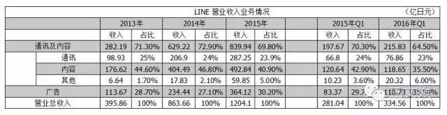 再來(lái)詳細(xì)看看Line的營(yíng)業(yè)收入情況。 Line的收入主要由通信、內(nèi)容和廣告三部門(mén)組成。通信業(yè)務(wù)收入主要來(lái)自貼圖表情的銷(xiāo)售,處于持續(xù)增長(zhǎng)之中。不外它在總收入的占比基本不亂在24%左右,Line更大的收入來(lái)自廣告業(yè)務(wù)以及內(nèi)容提供中的游戲部門(mén)。
