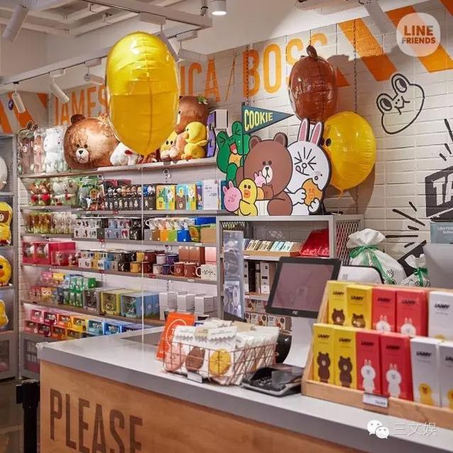 在2013年4月,Line還推出了另一部?jī)和騽?dòng)畫(huà)《LINETOWN》,每集30分鐘,采用小戲院動(dòng)畫(huà)的原班聲優(yōu)。 除了動(dòng)畫(huà),圍繞Line品牌形象制作的漫畫(huà)也在2013年5月開(kāi)始于《周刊少年SUNDAY》和《周刊YOUNGJUMP》上連載。 第五步,表情IP的商品和線(xiàn)下商店 除了線(xiàn)上和出版物,Line的表情卡通形象更加走進(jìn)了各種實(shí)體商店,萌萌的可妮兔和布朗熊泛起在了各種文具、食物包裝上。 Line最早是在日本開(kāi)設(shè)貼圖實(shí)體店,之后不斷擴(kuò)充貼圖形象的衍出產(chǎn)品種類(lèi),并成功轉(zhuǎn)型開(kāi)設(shè)Line friends這一主題商店,2013年到目前已在全球開(kāi)設(shè)44家店面。 Line Friends Cafe&Store 既包括紀(jì)念品商店,也包括主題咖啡店,里面主要售賣(mài)一些Line貼圖形象的毛絨玩具、文具和餐具等周邊商品,并提供餐飲服務(wù)。它圍繞布朗熊和可妮兔兩個(gè)主要卡通形象進(jìn)行主題營(yíng)造,同時(shí)推出各種Line平臺(tái)上較熱點(diǎn)的貼圖形象周邊,并不斷與著名品牌合作聯(lián)名推出新產(chǎn)品,增強(qiáng)Line friends的品牌價(jià)值,實(shí)現(xiàn)更大的貼圖授權(quán)收益。 香港的Line Friends