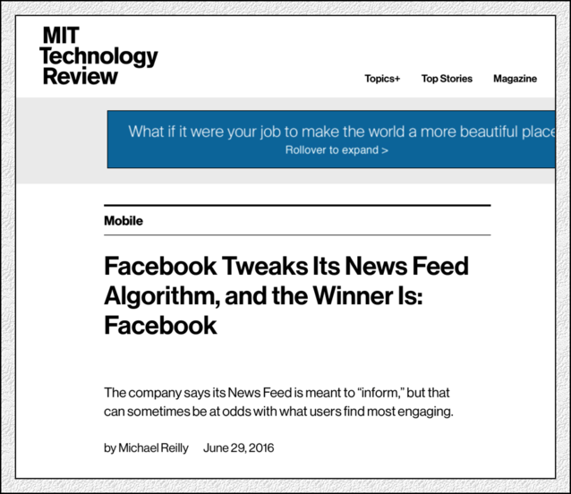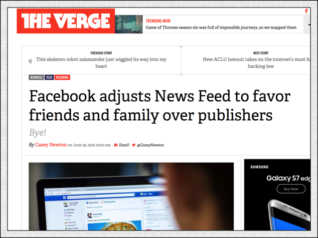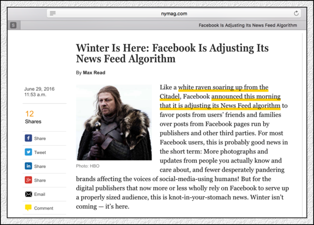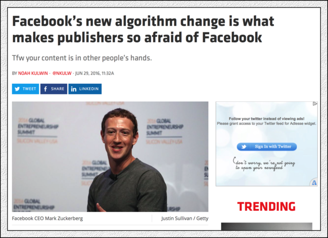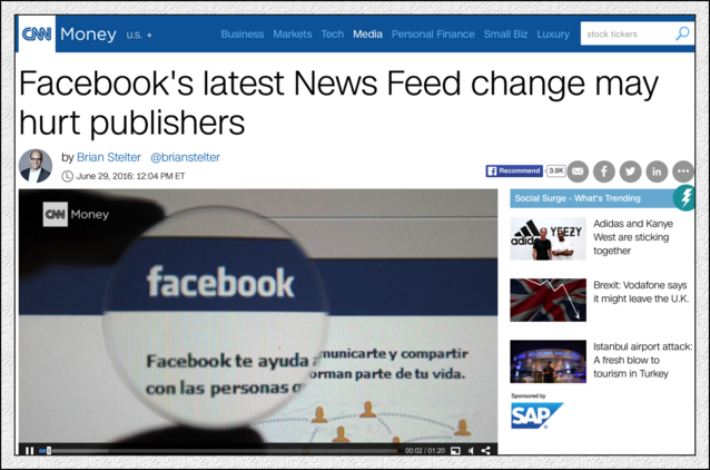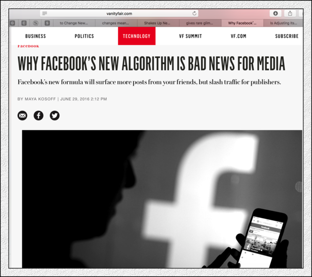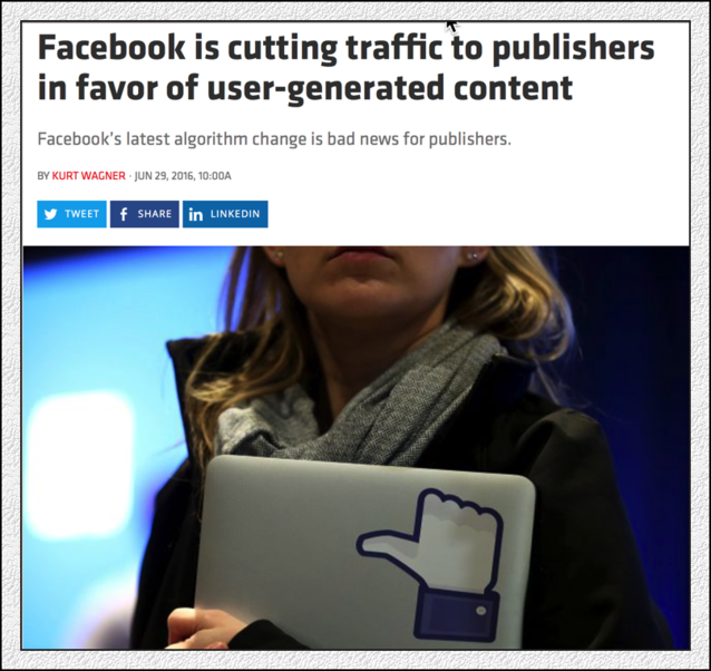 6月底,F(xiàn)acebook又公布調(diào)整算法了,這回調(diào)整,受傷的仍是媒體(Publishers)。幾乎所有的美國(guó)媒體這幾天討論的都是Facebook算法,以及自己身上正在流血的傷口?膳碌氖,媒體們?cè)谶M(jìn)行這次報(bào)道的時(shí)候,洋溢的是某種哀怨,而不是憤怒。他們憤怒,但表現(xiàn)的只是哀怨。與狼共舞,不時(shí)地被狼咬上一口,很正常的。 在2016年5月經(jīng)歷了“Facebook新聞偏見(jiàn)門(mén)”、Facebook “蒂爾門(mén)”兩次沖擊之后,美國(guó)的媒體可能無(wú)法想象,這么快又會(huì)面對(duì)一次來(lái)自Facebook的新的震撼教育。