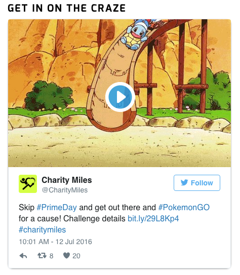 2. 別忘了,Pokémon GO還可以是今年最佳健身類APP 假如你的公司正好深耕于人們的運(yùn)動健康數(shù)據(jù)的挖掘或是像微公益一樣為公益捐步數(shù),那么Pokémon GO將為你提供極大的助益。要知道Pokémon GO的玩家都走得超級多,他們得到四處抓精靈,走2KM/5KM 的路,只是為了孵精靈蛋。難怪會有人說這是今年最佳的健身類APP,究竟國外為了抓小精靈天天走10公里當(dāng)即瘦下10公斤的勵志故事已經(jīng)發(fā)生。而Charity Miles就是一家專門人們的行走、步行或騎自行車的里程轉(zhuǎn)化為捐款的APP,