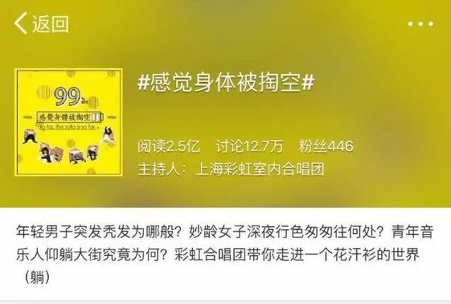 昨天一整天,榜妹的朋友圈都被一首神曲刷屏了。歌名很污,叫《感覺身體被掏空》。在好奇心的驅(qū)使下榜妹聽完了,沒想到,其實太魔性,于是背著老板聽了一遍又一遍。 假如你還沒有聽,趕快戳下方視頻! 聽完你一定會轉(zhuǎn)發(fā)的 不得不說,這首神曲又將成為霸占輿論高地的一枚爆款。而這首神曲的背后創(chuàng)作團隊——上海彩虹室內(nèi)合唱團, 這次是如何在短時間內(nèi)打造出爆款神曲的呢? 昨天上午9點40分左右,“上海彩虹室內(nèi)合唱團”推送了一篇《“汪汪汪!汪汪汪汪汪汪汪汪!”》的文章,其中插入了這首《感覺身體被掏空》的短視頻。與此同時,其官方微博也發(fā)布了該視頻,并配文“年青男子突發(fā)禿發(fā)為哪般?妙齡女子深夜形色匆匆往何處?青年音樂人仰躺大街畢竟為何?” 發(fā)布八小時后,公家號文章迅速破10w+,并且在當(dāng)晚11點,該視頻在秒拍的播放數(shù)達(dá)到1111萬。 截至到今天下戰(zhàn)書14點30分,這篇《“汪汪汪!汪汪汪汪汪汪汪汪!”》閱讀達(dá)到14萬,后臺粉絲增長13000。 @上海彩虹室內(nèi)合唱團 發(fā)布的這條微博閱讀達(dá)到1796萬,轉(zhuǎn)評12萬,點贊3萬。意外之喜是,僅僅一天的時間,微博的粉絲就從原先的1.5萬增長至7.5萬,凈增6萬粉絲,秒拍上的視頻播放量也達(dá)到了1842萬。
