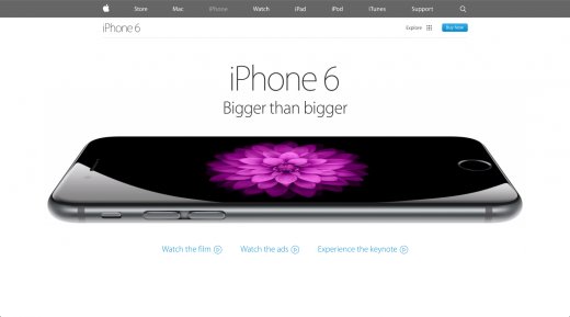 主頁并非動彈翻頁越來越流行的獨一地方。跟著超長動彈網(wǎng)站(即一頁式網(wǎng)站)日益變得熱點,動彈帶來的好處也更多,除主頁面外的其他很多地方也開始泛起這種模式,好比有關(guān)網(wǎng)頁以及產(chǎn)品網(wǎng)頁等,它們都已成為展示各種內(nèi)容的簡樸顯示方式。好比,蘋果iPhone 6的動彈翻頁方式已經(jīng)擴展到很多地方,可以展示該產(chǎn)品各種特點和機能。此外,iPhone 6網(wǎng)站也增加了一些流暢的動畫,讓動彈體驗在視覺上變得更具吸引力。