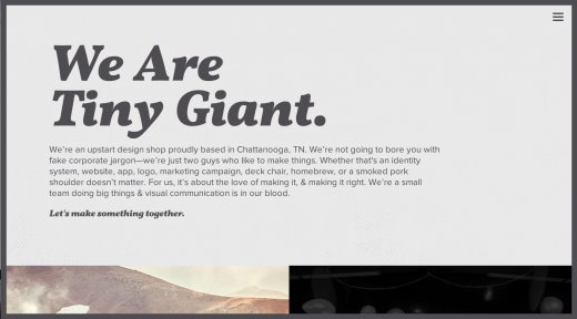 2014年,字體在很多網(wǎng)站設(shè)計中施展重要作用,我未發(fā)現(xiàn)這種趨勢在短期內(nèi)改變的跡象?墒2015年,我看到網(wǎng)站中的標題和字體變得越來越大?鋸埖卣f,就連天上的飛機可能都能看到地面上的字。當你訪問Tiny Giant的網(wǎng)站時,你會看到很大的字體。這實際上是一種聲明,讓你很難錯過。大字體將繼承在2015年的網(wǎng)站設(shè)計中施展重要作用,成為確保進步訪客視覺層次的方法。訪客首先會看到最大的字體,由于那會首先吸引你的留意力。