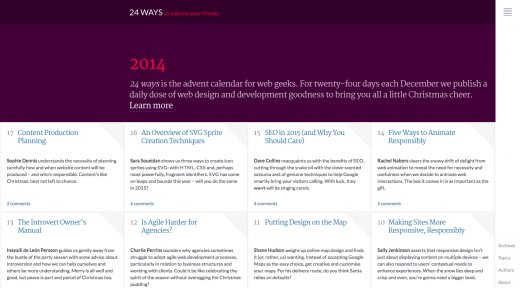 響應(yīng)式網(wǎng)站設(shè)計已經(jīng)流行了一段時間,可是直到近來,大多數(shù)網(wǎng)站設(shè)計重點都放在令網(wǎng)站在桌面設(shè)備上看起來更好,而在手機或平板設(shè)備上看得過去即可。不管何種設(shè)備,響應(yīng)式網(wǎng)站設(shè)計正邁向更好體驗。我們正看到這種設(shè)計元素向移動設(shè)備上轉(zhuǎn)移,并在更廣泛地使用。好比24ways與Rawnet都展示了這種觀念,將類似應(yīng)用和響應(yīng)式菜單添加到整個網(wǎng)站中,而不僅僅有更小視口的設(shè)備上。在這種情況下,這兩家網(wǎng)站選擇靠左或靠右的垂直菜單,而不是位于頂部的水平菜單,使用起來更像彈出/滑出應(yīng)用式菜單,這種技術(shù)答應(yīng)網(wǎng)站應(yīng)用與響應(yīng)式設(shè)計泛起在更小的視口上。