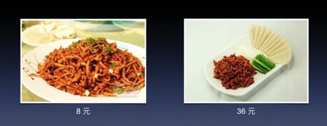 價格有什么變化?我年青時候左邊一大盤差未幾有一斤肉,在東北的菜館一定有一斤肉,差未幾要 8 塊錢。現(xiàn)在呢?36 塊錢。我想拿這個說明一下消費觀念的變化跟發(fā)展水平是息息相關(guān)的。