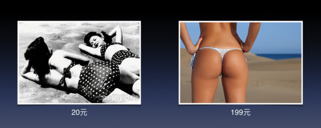 再看一下這個例子,我年青的時候假如去海灘上看看,婦女們穿的泳裝基本是這樣子,包住臀部的樣子比腦袋還要大。這些年我們?nèi)ズ┛吹降挠狙b已經(jīng)是這個樣子。價格發(fā)生了什么變化?左邊那么多布料用了 20 塊錢,右邊基本沒用布料,我們甚至懷疑那是不是布料,它還要 199 塊錢。所以良多時候就是這樣非常簡樸的道理,外國人不知道,由于那些發(fā)達國家沒有經(jīng)歷過這樣的時代,但是我們很清晰。