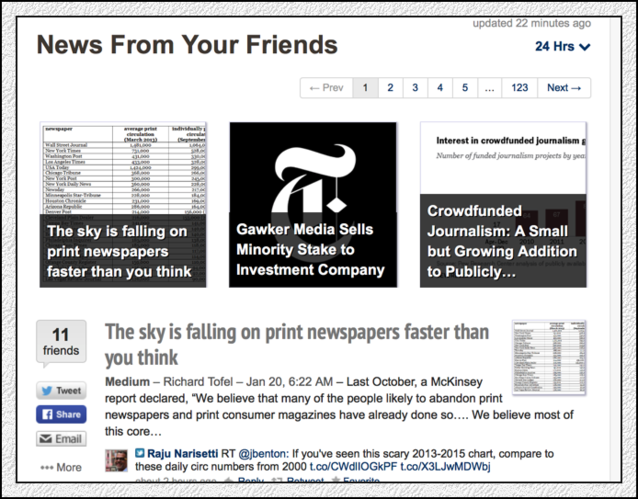 早上醒來,打開手機(jī),一個美國標(biāo)題黨制作的標(biāo)題,在杰羅姆個性化定制的信息列表中,排在榜首。標(biāo)題是這樣寫的:報業(yè)的天塌了,塌的速度比你想象得要快!(見下圖)