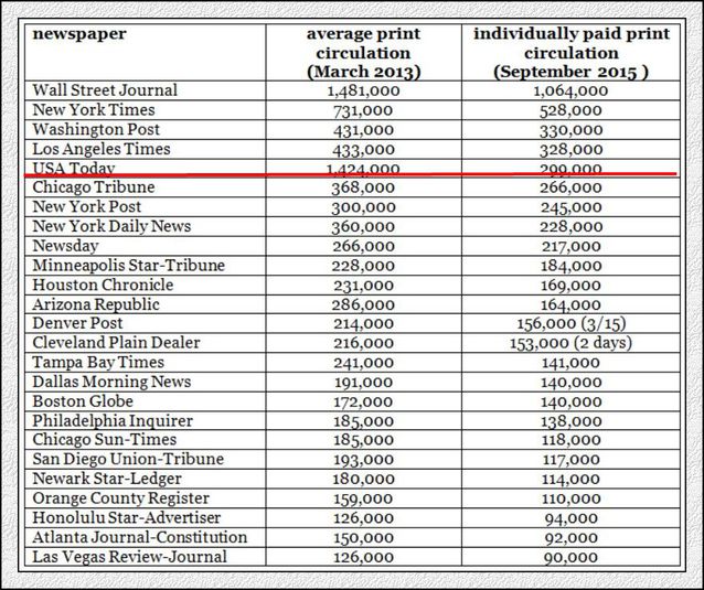 在2013年,美國有兩份發(fā)行量在100萬以上的大報,華爾街日報和本日美國報,到了2015年,只有一份了,最后剩下的這一份按照下跌的趨勢與下跌的幅度,2016年極有可能破百。本日美國報2013年擁有142萬份的驕人發(fā)行數(shù),但到了2015年,僅有98萬份了。理查德·托福在表中給出的數(shù)據(jù)是29.9萬份,98萬這一數(shù)字,是本日美國報在看到理查德·托福的研究后,自己出頭具名澄清的數(shù)字。