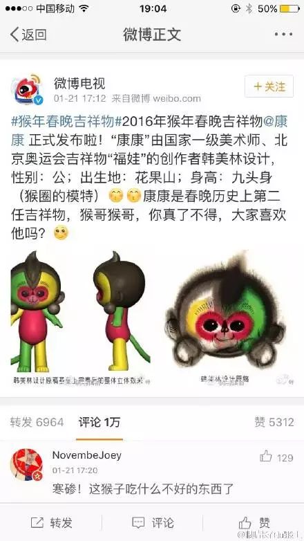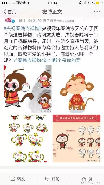 也難怪在央視發(fā)布吉利物的半個(gè)小時(shí)內(nèi),評(píng)論就已經(jīng)由萬,微博話題#猴年春晚吉利物#三個(gè)小時(shí)閱讀量就達(dá)811萬,討論5.3萬,登上微博排行榜第一名。
