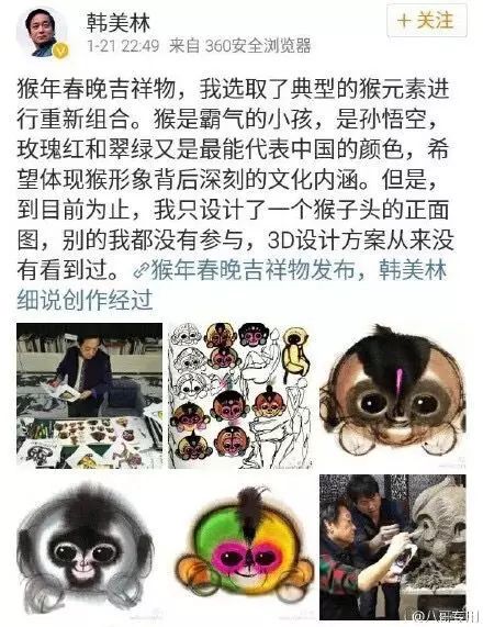 好吧,晚間終于等來了設(shè)計(jì)師的回應(yīng):那竟然是猴子在吃過東西后兩腮鼓起的狀態(tài),這也太抽象了吧。 設(shè)計(jì)者韓美林也表示,關(guān)于“康康”兩腮上那兩個(gè)球,春晚節(jié)目組也曾經(jīng)質(zhì)疑過,然而他堅(jiān)持留存。 他解釋說,小猴子吃東西吃到良多的時(shí)候,腮幫子就會(huì)呈現(xiàn)出鼓鼓的樣子,而這兩個(gè)球就為了體現(xiàn)這種效果。 不可否認(rèn)很多關(guān)于猴子的藝術(shù)品上也會(huì)專門做這樣的設(shè)計(jì),但是對(duì)于愛美、愛萌的大眾來說好像仍是表示無法理解。 疑問二:九頭身? 下面是對(duì)康康的先容: