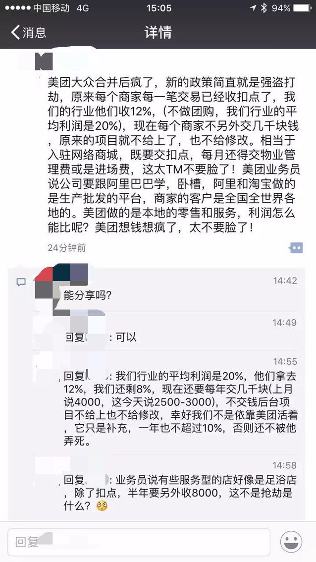 G先生頗無奈地說,“大約十天左右前,新美大溘然來了撥新的業(yè)務員,跟我講要抽取每年4000元的用度。這幾天又來催我,交2000元。假如不交,店面在網(wǎng)站上的信息就不予更改調(diào)整。”G先生表示,這太令人生氣了。“十幾二十塊錢的團購生意,還被剝這么多層皮,我們整個行業(yè)還要不要活了?!”