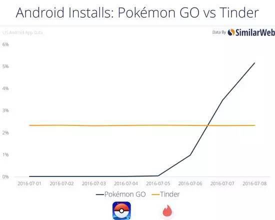 所有 Android 平臺(tái),Pokémon GO 與 Tinder(一款約pao App) 的裝機(jī)量
