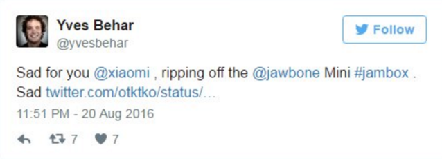 Jawbone首席運營官、Fuseproject首席設(shè)計師伊夫斯·貝哈爾在Twitter上直接@小米,稱小米方盒子藍牙音箱抄襲了自家的Jawbone Mini Jambox音箱的設(shè)計,并且對小米的行為感到悲哀。