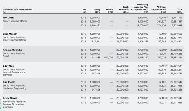 蘋果公司舉例想證實App Store在iPhone銷量下滑的情況下,應(yīng)用銷售在特定地區(qū)是增長的,新游戲推動了應(yīng)用銷售增長,以及用戶適應(yīng)訂閱模式愿意長期支付用度。 App Store等服務(wù)業(yè)務(wù)帶來的營收是蘋果公司上一年財報中未幾的亮點,也是蘋果公司高管一直夸大重點發(fā)展的業(yè)務(wù),即便App Store營收目前還無法撐起iPhone等硬件銷售下滑帶來的負(fù)面影響,不外增速老是讓人滿足的,并且App Store營收相稱于純收入,這些都是可以直接計入利潤的。 蘋果公司表示自2008年App Store面世以來,開發(fā)者已經(jīng)獲得了超過600億美元收入,推導(dǎo)可知蘋果公司獲得257億美元的收入,這都是現(xiàn)金流,直接晉升利潤,股東天然滿足。 蘋果公司高管現(xiàn)金激勵減少 但他們收入主要部門是期權(quán) 蘋果公司高管接受總薪酬減少的動靜,是SEC文件表露而恰好泛起,這是高管們對蘋果公司總營收下滑負(fù)責(zé)的一種表現(xiàn)方式,但假如仔細(xì)研究高管們的總薪酬,大家就會明白,高管們薪酬減少的絕對值并未幾,這是由于高管們和普通員工薪酬構(gòu)成的不同。 對于美國的科技公司員工來說,薪酬包括基本薪酬(年薪)、年終獎金以及期權(quán),在年薪固定或每年微漲、期權(quán)按工作時間兌現(xiàn)的情況下,年終獎金會影響到總薪酬的多寡。媒體報道中不僅僅是庫克總薪酬減少,蘋果高管們的薪酬同樣受到影響,均勻整體下滑10.5%。在2016年之前的4年,由于蘋果公司年年增長的業(yè)績,蘋果的高管是獲得最高額的現(xiàn)金激勵的,2016年蘋果公司的總營收和盈利都不如預(yù)期,這也影響到蘋果公司高管們的錢包,但是數(shù)據(jù)列出來后,大家就會發(fā)現(xiàn)高管們總薪酬減少的數(shù)額并未幾——對于他們2000萬美元的總薪酬來說,對于普通員工這當(dāng)然是一大筆錢了。高管們薪酬的大頭是期權(quán),而普通員工比較正視現(xiàn)金獎勵,由于期權(quán)總數(shù)有限。 詳細(xì)到蘋果公司CEO庫克,他的2016年總薪酬為870萬美元,比2015年的1030萬美元減少160萬美元,而這是他基本薪酬從200萬美元增加到300萬美元的基礎(chǔ)上,所以庫克今年拿得手的現(xiàn)金獎金比去年減少263萬美元。 SEC(美國證券交易委員會)表露的蘋果公司文件顯示,蘋果公司CEO Tim Cook(蒂姆·庫克)2014財年薪酬總額為922萬美元,是其2013財年薪酬(430萬美元)的2.1倍,其中包括工資174萬美元,非股權(quán)激勵薪酬670萬美元。研究每年詳細(xì)的數(shù)據(jù)可知庫克每年的基本薪酬是在增長的,分別從2014年的174萬美元,2015年的200萬美元到2016年的300萬美元,確定庫克基本薪酬的就是蘋果公司薪酬委員會,這個委員會也決定所有其他高管的薪酬。 對于高管來說,總薪酬比去年降低也不是良多,由于期權(quán)獎勵是同樣的。他們總薪酬中的大頭恰是期權(quán)獎勵。