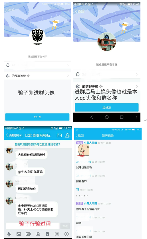 例如,最近在模型玩具圈中還有這樣的情況泛起。某人加進(jìn)一些模型玩具的群里,先了解到群里一些比較活躍的群友或治理員后,等他們下線后就改成他們的網(wǎng)名,從而騙取群友的信任,故意利用閑魚售賣低價二手閑置物品。而后套取用戶的支付寶賬號、家庭地址、姓名、手機(jī)號等后,又找借口說需要先轉(zhuǎn)個郵費或是訂金再發(fā)貨來脫身。一來一去,終極就是想利用這些信息進(jìn)行盜號或是販賣信息。