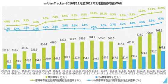 摩拜單車(chē)的實(shí)力和潛力早在之前就現(xiàn)已露出端倪,第三方商場(chǎng)調(diào)研公司艾瑞咨詢(xún)近來(lái)發(fā)布《2017我國(guó)同享單車(chē)職業(yè)研究陳述》。陳述指出,本年2月底,摩拜單車(chē)在所有出行效勞中的滲透率已達(dá)13.9%,相當(dāng)于每7自己就有1人運(yùn)用摩拜單車(chē)。