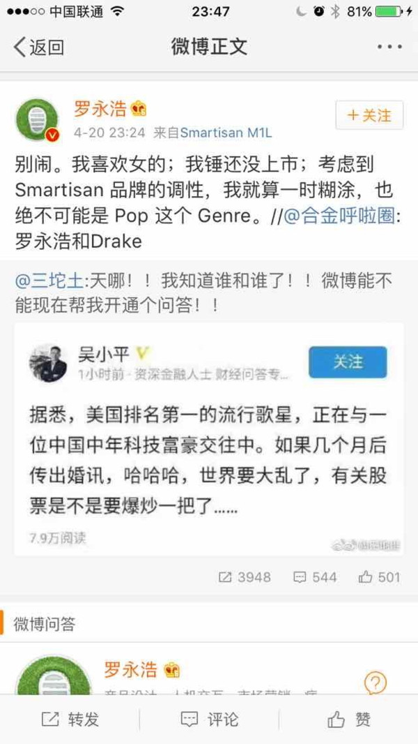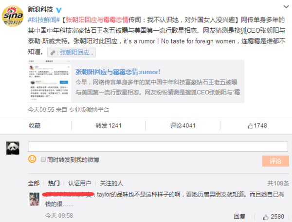今日,張朝陽(yáng)突然登上了新浪微博熱搜,是不是決定滿臉問(wèn)候,搜狐老邁在新浪微博火了?這兩貨不是競(jìng)爭(zhēng)對(duì)手嗎?近日,網(wǎng)上瘋傳某我國(guó)中年科技富豪與美國(guó)第一流行歌星相戀,網(wǎng)友紛紛猜想這是暗指搜狐CEO張朝陽(yáng)與美國(guó)歌星是霉霉。但遭遇張朝陽(yáng)強(qiáng)勢(shì)否定,稱“我不認(rèn)識(shí)她,對(duì)外國(guó)女性沒(méi)興趣”。 這下網(wǎng)友評(píng)論的更熱鬧了,有霉霉粉絲出來(lái)辯駁稱taylor的品嘗不止如此,看她歷屆男朋友就知道,并且她自個(gè)有錢(qián)的很,言下之意即是霉霉還看不中張朝陽(yáng)呢。 一起有人為霉霉抱屈,稱張朝陽(yáng)急著跳出來(lái)回答給自個(gè)加戲,正本張朝陽(yáng)不出來(lái)回答,沒(méi)人專注這個(gè)事,也上不了熱搜,他出來(lái)加個(gè)戲,鍋還要女方背。 相較于粉絲的嘴炮,筆者更關(guān)心的是這場(chǎng)緋聞的真實(shí)性,究竟是確有其事,仍是一場(chǎng)營(yíng)銷(xiāo)呢?如果不是空穴來(lái)風(fēng),這個(gè)中年科技富豪究竟是誰(shuí)呢? 有趣的是,在緋聞事件還沒(méi)有多少人重視的時(shí)分,錘子科技的羅永浩第一時(shí)間跳出來(lái)撇清聯(lián)系表明:“別鬧,我喜愛(ài)女的……我就算一時(shí)糊涂,也絕不可能是Pop這個(gè)Genre。”被網(wǎng)友戲稱活潑得像高仿號(hào)。 聯(lián)系我國(guó)互聯(lián)網(wǎng)、中年、對(duì)股票有影響、富豪,本身契合條件的就沒(méi)幾個(gè)。 首要必定不是雷軍,由于雷軍英語(yǔ)不行。 劉強(qiáng)東和奶茶妹妹好著呢,也不太像。 難道是常往美國(guó)跑的賈躍亭?但現(xiàn)在的樂(lè)視風(fēng)波不斷,近期和易道的“羈絆”想必夠讓賈躍亭焦頭爛額了,賈躍亭的可能性也不大。 值得注意的事,在導(dǎo)致廣泛重視之后,爆料的原博就刪掉了這條微博,難道這次爆料是坑爹的?圍觀大眾怎么看? |