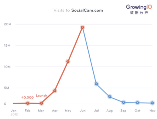 可是好景不長,F(xiàn)acebook 不斷收到用戶關(guān)于 SocialCam 侵略他們隱私的投訴,未經(jīng)贊同就在 Facebook 上面共享了他們觀看的視頻。最終, Facebook 決議封閉 SocialCam 的流量進(jìn)口。失掉 Facebook 的流量后,SocialCam 的訪問用戶量“斷崖式跌落”;再加上商品不完善,用戶留存率極低,不到一年千萬級訪問量就根本清零。