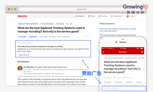 可是他們直到 2016 年 3 月,月活用戶到達(dá) 1 億時,才正式開端上線廣告投進(jìn)。時刻跨度將近3年,情緒依然十分慎重。開端的廣告只會在極少數(shù)發(fā)問頁面呈現(xiàn),廣告信息也會通過各種精挑細(xì)選。而且最開端還只與 4 家廣告客戶協(xié)作——Lever、Uber、Wealthfront 和 Sunrun。
