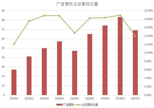 該季度網(wǎng)絡(luò)廣告的營收同比增加47%至68.88億元。但比較2016Q3和2016Q4的74億元和83億元?jiǎng)t有所降低。從曩昔兩年的數(shù)據(jù)來看,來自網(wǎng)絡(luò)廣告的增速現(xiàn)已離別之前動(dòng)輒三位數(shù)的增加,而保持在40%-50%之間。
