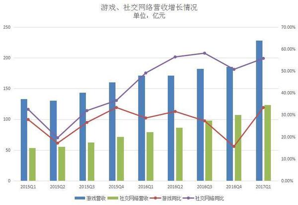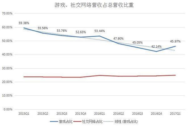從游戲和交際網(wǎng)絡(luò)營收增速的比照?qǐng)D來看,近來兩年時(shí)間里前者都要慢于后者。從這兩項(xiàng)事務(wù)占公司總營收的比重來看,交際網(wǎng)絡(luò)一向保持在20%-30%之間。而游戲收入占比則在直線降低,在2016Q2降低至50%一下,在2016Q4占比僅為42.14%。但到了該季度,占比又有所上升。