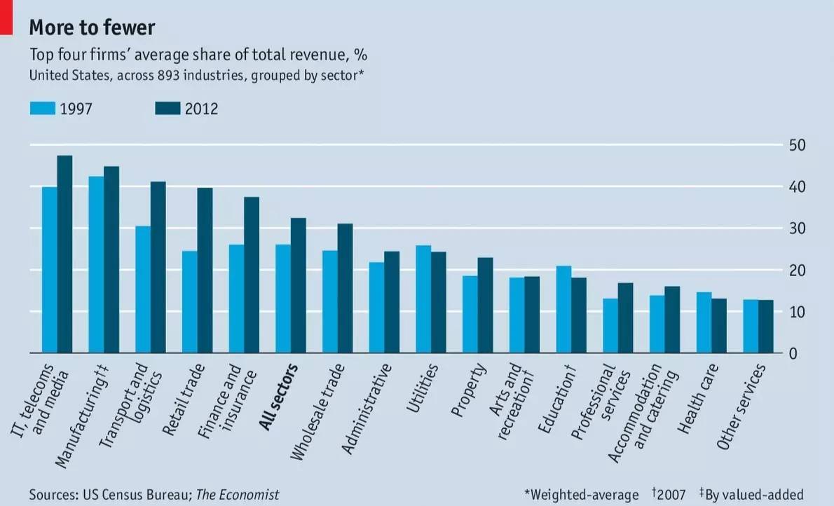 收入的不平等進(jìn)一步加重 盡管如此,別的專家的研討還顯現(xiàn),跟著市場集中度越來越高,市場位置高的公司越來越強(qiáng),草創(chuàng)公司取得成功的才能也更加降低。因?yàn)閷φ坌略鼍蜆I(yè)崗位都發(fā)源自成功的草創(chuàng)公司,這種狀況也按捺了新就業(yè)時機(jī)的發(fā)生。 彼得·歐爾薩格(Peter Orszag)曾在《彭博視角》(Bloomberg View)節(jié)目撰文指出,超級明星公司取得遠(yuǎn)超正慣例劃的出資報(bào)答,進(jìn)一步加重收入上的不平等,也就家常便飯了。歐爾薩格與貝拉克·奧巴馬(Barak Obama)總統(tǒng)任內(nèi)的經(jīng)濟(jì)參謀委員會主席賈森·富爾曼(Jason Furman)一起指出,本錢報(bào)答率的進(jìn)步并沒有帶來對公司出資添加——這是獨(dú)占力氣構(gòu)成的另一表現(xiàn)。 反獨(dú)占滯后 有些芝加哥學(xué)派成員對此表明附和。該學(xué)派是現(xiàn)代反獨(dú)占理論的源頭。20世紀(jì)70到80年代,芝加哥大學(xué)的一群專家經(jīng)過論辯顛覆了反獨(dú)占法。他們以為,并購發(fā)生的經(jīng)濟(jì)效率進(jìn)步,其好處足以跨越對公司規(guī)劃的任何憂慮。例子觸及消費(fèi)者福祉:并購是不是給兼并后的公司帶來進(jìn)步消費(fèi)者報(bào)價的權(quán)利,以及并購后職業(yè)準(zhǔn)入門檻是不是會高到新來者無法輕松跨越的程度?美國反獨(dú)占法的執(zhí)法者們發(fā)生了不堅(jiān)定。從1970到1999年,美國每年均勻提交15.7起反獨(dú)占訴訟案。這以后這一數(shù)字一路降低,2000到2014年間降至了缺乏3起。