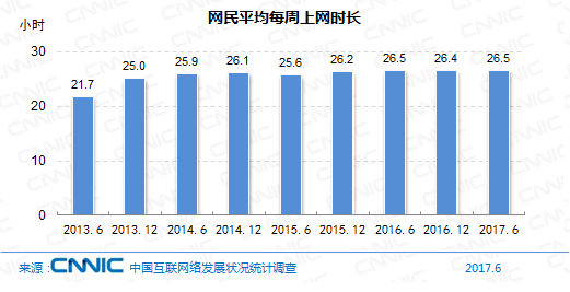 2017年上半年,我國(guó)網(wǎng)民的人均周上網(wǎng)時(shí)長(zhǎng)為26.5小時(shí),與2016年根本相等。