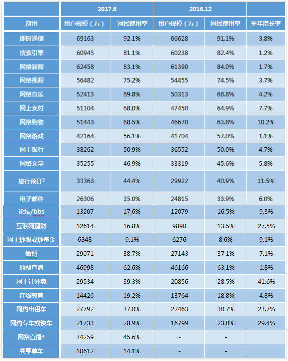 2017年上半年,我國(guó)個(gè)人互聯(lián)網(wǎng)運(yùn)用堅(jiān)持快速開展,其間網(wǎng)上外賣和互聯(lián)網(wǎng)理財(cái)是添加最快的兩個(gè)運(yùn)用,半年添加率別離為41.6%和27.5%,網(wǎng)絡(luò)購(gòu)物仍堅(jiān)持較快添加,半年添加率為10.2%;手機(jī)運(yùn)用方面,手機(jī)外賣、手機(jī)在線教育課程用戶規(guī)劃添加最為顯著,半年添加率別離為41.4%和22.4%。