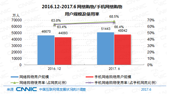 到2017年6月,我國(guó)網(wǎng)絡(luò)購(gòu)物用戶規(guī)劃到達(dá)5.14億,相較2016年末添加10.2%,其間,手機(jī)網(wǎng)絡(luò)購(gòu)物用戶規(guī)劃到達(dá)4.80億,半年添加率為9.0%,運(yùn)用份額由63.4%增至66.4%。