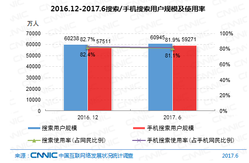 到2017年6月,我國(guó)搜索引擎用戶規(guī)劃達(dá)6.09億,運(yùn)用率為81.1%,用戶規(guī)劃較2016年末添加707萬(wàn),添加率為1.2 %;手機(jī)搜索用戶數(shù)達(dá)5.93億,運(yùn)用率為81.9%,用戶規(guī)劃較2016年末添加1760萬(wàn),添加率為3.1%。