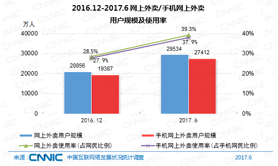 到2017年6月,我國(guó)網(wǎng)上外賣用戶規(guī)劃到達(dá)2.95億,較2016年末添加8678萬(wàn),添加率到達(dá)41.6%。其間,我國(guó)手機(jī)網(wǎng)上外賣用戶規(guī)劃到達(dá)2.74億,添加率為41.4%,運(yùn)用份額到達(dá)37.9%,提高10個(gè)百分點(diǎn)。