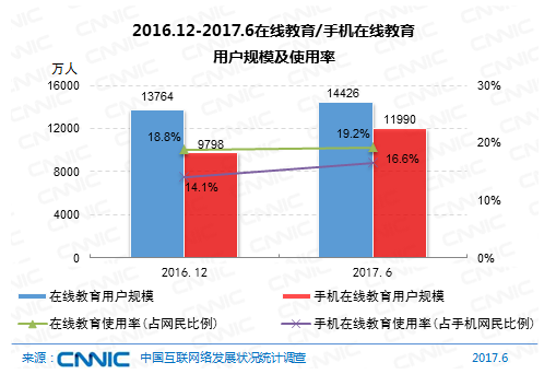 到2017年6月,我國(guó)在線教育用戶規(guī)劃達(dá)1.44億,較2016年末添加662萬(wàn)人,半年添加率為4.8%;在線教育用戶運(yùn)用率為19.2%,較2016年末添加0.4個(gè)百分點(diǎn)。其間,手機(jī)在線教育用戶規(guī)劃為1.20億,與2016年末比較添加2192萬(wàn)人,添加率為22.4%;手機(jī)在線教育用戶運(yùn)用率為16.6%,比較2016年末添加2.5個(gè)百分點(diǎn)。