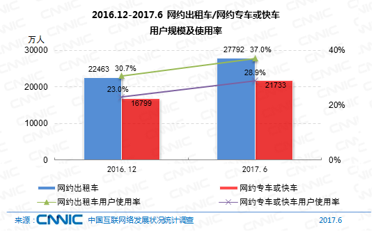 到2017年6月,我國(guó)網(wǎng)約出租車用戶規(guī)劃到達(dá)2.78億,較2016年末添加5329萬(wàn),添加率為23.7%。網(wǎng)約專車或快車用戶規(guī)劃到達(dá)2.17億,添加率為29.4%,用戶運(yùn)用份額由23%提高至28.9%。
