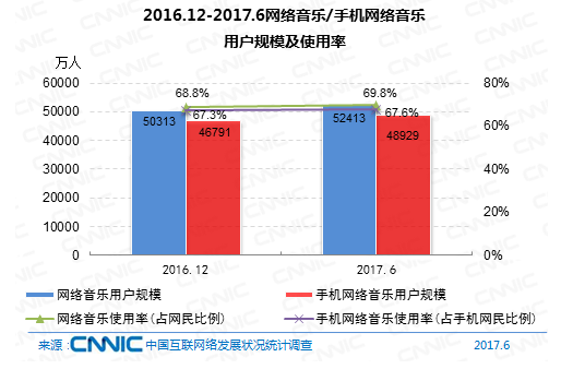 到2017年6月,網(wǎng)絡(luò)音樂用戶規(guī)劃到達(dá)5.24億,較去年末添加2101萬(wàn),占網(wǎng)民全體的69.8%。其間手機(jī)網(wǎng)絡(luò)音樂用戶規(guī)劃到達(dá)4.89億,較去年末添加2138萬(wàn),占手機(jī)網(wǎng)民的67.6%。