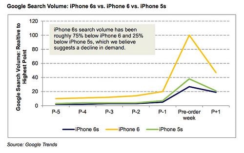 iPhone6s/Plus發(fā)布之初,首周銷量破紀(jì)錄,給蘋果股價(jià)起到了一定提振作用。不外資本市場(chǎng)并不看好未來iPhone6s的發(fā)展,以為蘋果將完不成其制定的產(chǎn)量目標(biāo),美國投行太平洋皇冠證券的王牌分析師安迪·哈格利夫斯發(fā)表的講演稱,根據(jù)谷歌搜索量、可供給數(shù)目、第三方調(diào)查和蘋果發(fā)表的聲明等推導(dǎo)出iPhone6S的需求將不如iPhone6。
