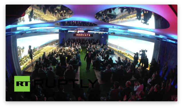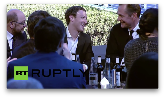 【圖說:施普林格官網(wǎng)及其旗下的眾多報(bào)紙,發(fā)布了良多照片造勢,但這樣“哥倆好”的畫面及會(huì)場全景只能辛勞地到俄國人發(fā)布的視頻中去截圖。RT威武! 歐洲反谷歌旗手、阿克塞爾·施普林格團(tuán)體CEO馬塞亞斯·多夫納(上圖為小扎頒獎(jiǎng)?wù)撸┰陬C獎(jiǎng)儀式上給了扎克伯格高度的評(píng)價(jià),這樣的評(píng)價(jià)大家早就耳熟能詳了,值得引述的只有這一句,“Facebook 作為一個(gè)成功的分發(fā)平臺(tái),是媒體的公平(fair)伙伴”。這句話,可能半真半假,似是而非,良多媒體人與媒體機(jī)構(gòu)是并不認(rèn)同的。多夫納心里,可能也并不完全是這樣想的,只是,與谷歌比擬,他們還沒有反目。 扎克伯格在儀式上,也只撿大家愛聽的講。好比,他在獲獎(jiǎng)感言中揄揚(yáng)自己換尿布的技術(shù)如何高明,花20秒就可以搞定。他也不忘了談一下他的標(biāo)牌性T恤。這些輕松的話題,讓他與一房子的老歐洲精英們一起會(huì)心地微笑。那些嚴(yán)厲的具有爭議的重大方向性話題,以及門外零星的抗議者,換個(gè)場合再議吧。 為了表示對(duì)于頒獎(jiǎng)?wù)叩淖鹬,小扎換了身西服,但是,為了表示他不向金科玉律屈服,他仍舊率性地不戴領(lǐng)帶。