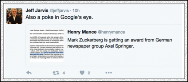 【圖說:在谷歌陣營的人看來,這場流動(dòng)來者不善。聞名的親谷歌學(xué)者杰夫·杰維斯開玩笑說:這不是戳谷歌的眼睛嗎!】 谷歌是傳統(tǒng)媒體的敵人,臉書也是。不外,此一時(shí),彼一時(shí),合縱聯(lián)橫的政治婚姻、神圣聯(lián)盟隨時(shí)都會(huì)泛起。傳統(tǒng)媒體指望通過這樣的借力使力,在縫隙間生存,讓自己借機(jī)發(fā)展壯大,是一廂情愿的。但是,傳統(tǒng)媒體的確不能關(guān)起來門來自娛自樂,孤芳自賞,必需與狼共舞,踩著高科技的節(jié)奏飛上一會(huì)。 此外,高科技巨頭們對(duì)于新聞業(yè)發(fā)展的貢獻(xiàn),也是無法無視的,事實(shí)上,后人們?cè)谧珜懶侣勈返臅r(shí)候,谷歌、臉書這些門外的野蠻人將成為當(dāng)然的主角,全球各地精英新聞學(xué)院出身的精英專業(yè)人士,從來不是新聞史臺(tái)面上確當(dāng)然主角,也永遠(yuǎn)不會(huì)是(很殘酷,是不是?但符合顛覆者不來自內(nèi)部的鐵律)。施普林格把第一個(gè)施普林格獎(jiǎng)?lì)C給小扎,小扎當(dāng)之無愧。而那個(gè)沒有泛起在頒獎(jiǎng)儀式上助興的谷歌,假如馬塞亞斯·多夫納足夠大度的話,同樣應(yīng)該在某年授與其一個(gè)大獎(jiǎng)。由于,谷歌對(duì)于新聞業(yè)的發(fā)展作出的貢獻(xiàn),比臉書早,迄今為止,也一點(diǎn)不比臉書小。當(dāng)然,谷歌對(duì)于新聞業(yè)的轔轢與臉書一樣,怎么評(píng)估都不會(huì)過份。 歷史,不都是以這樣的方式寫就的嗎? 稍等,新聞業(yè)(journalism)這個(gè)詞在有了谷歌與臉書之后,是不是需要重新定義了?在中國,有了早年的新浪、網(wǎng)易、搜孤,稍后的 BAT 之后,是不是也需要重新定義了?新聞早就不是原來的那個(gè)新聞,新聞業(yè)也早就不再是早先的那個(gè)新聞業(yè)了。