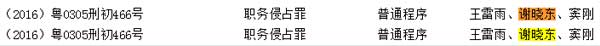 雷帝網(wǎng)從深圳南山法院官網(wǎng)發(fā)現(xiàn),王雷雨、謝曉東、竇剛已被深圳南山區(qū)人民法院立案,案件號為(2016)粵0305刑初466號,罪名是職務(wù)侵占罪,在2016年5月19日已開庭審理。 這一案件早前已在深圳南山區(qū)人民法院開庭審理,目前尚未宣判。 |