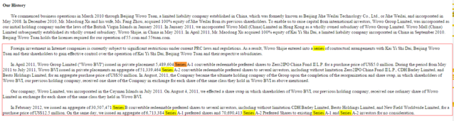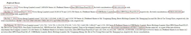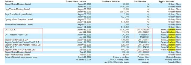 但翻出窩窩團(tuán)招股書(shū)中的History、Preferred Shares及Financing actvities三欄數(shù)據(jù),整個(gè)2011年窩窩團(tuán)共計(jì)融資為5500萬(wàn)美元,約為報(bào)道2億融資額的1/4。 2011年4月,清科資本投了500萬(wàn)美元。接下來(lái)5月和6月,鼎暉、清科分別跟投了3000萬(wàn)、200萬(wàn)美元。7月,Besto Holdings、天助等機(jī)構(gòu)共計(jì)注資1800萬(wàn)美元。 招股書(shū)詳細(xì)信息如下:
