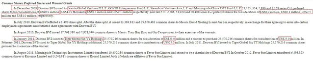 圖8:唯品會(huì)招股書(shū)顯示,唯品會(huì)在2011年4月11日獲得紅杉和DCM的實(shí)際融資金額為(3,904,865+95,283+11,974,108+25,249,636)=41,223,892美元。 |