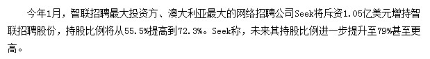 圖2:在窩窩團(tuán)招股書(shū)Preferred Shares一欄中寫(xiě)到,窩窩團(tuán)在2011年4月的A-1輪融資中獲得了清科資本的500萬(wàn)美元融資;5月和6月,鼎暉、清科分別跟投了3000萬(wàn)、200萬(wàn)美元;7月,Besto Holdings、天助等機(jī)構(gòu)共計(jì)注資1800萬(wàn)美元。2012年2月B輪融資中再獲得1250萬(wàn)美元的融資。 窩窩團(tuán)虛報(bào)融資是一個(gè)最具代表性的案例。窩窩團(tuán)最開(kāi)始向外公布上述融資動(dòng)靜時(shí),聲稱(chēng)融資將來(lái)自高盛。而媒體就此事采訪(fǎng)高盛時(shí),其相關(guān)負(fù)責(zé)人表示,對(duì)此事不作評(píng)論,但又建議記者,應(yīng)當(dāng)繼承關(guān)注這條動(dòng)靜,真相會(huì)得到澄清。 高盛謹(jǐn)嚴(yán)克制的暗示背后,代表了窩窩團(tuán)在資本市場(chǎng)上的潛伏危機(jī)。虛報(bào)融資這一行為,很可能導(dǎo)致外界在觀感上把VC/PE當(dāng)成同謀,危及投資機(jī)構(gòu)的信譽(yù)、職業(yè)道德。而如斯開(kāi)罪資本世界中的聞名機(jī)構(gòu),其實(shí)“勇敢”。 第二名、 智聯(lián)招聘651萬(wàn)美元變1億美元報(bào)道融資額:1.05億美元 真實(shí)融資額:651萬(wàn)美元 2013年1月,智聯(lián)招聘二股東麥格理拋售了手中全部股份,總價(jià)約近億美元。隨后有動(dòng)靜稱(chēng)Seek斥資1.05億美元接手麥格理拋售的股份,同時(shí)智聯(lián)招聘官方也公然回應(yīng),稱(chēng)二股東麥格理退出并非是拋售,而是大股東Seek更加看好。 在這起交易后,智聯(lián)招聘估值達(dá)到了5.58億美元。 以下為媒體報(bào)道截圖: