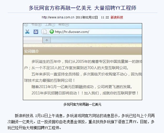 圖3:智聯(lián)招聘招股書(shū)中寫(xiě)到,2013年2月28日,智聯(lián)向Seek發(fā)售3,061,591股普通股,價(jià)值僅32.9141萬(wàn)美元;2013年10月31日,智聯(lián)又向Seek增發(fā)6,488,409股普通股,價(jià)值為528.4834萬(wàn)美元。兩次合計(jì)注資約561萬(wàn)美元。 第三名、 歡聚時(shí)代強(qiáng)調(diào)2300萬(wàn)報(bào)道投資額:1億美元 真實(shí)投資額:7700萬(wàn)美元 2011年2月,多玩網(wǎng)曾公布獲得1億美元融資,這一投資由老虎基金領(lǐng)投。 以下為媒體報(bào)道截圖: