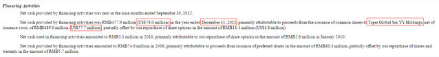 圖4:2011年8月,YY曾三次向老虎基金發(fā)售普通股共計(jì)7500萬(wàn)美元。