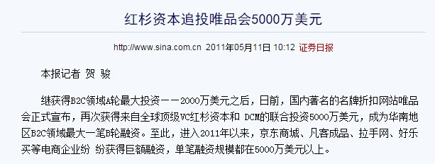 圖7:2007年7月26日,B輪融資,向IDG增發(fā)B輪優(yōu)先股5,643,990股,每股0.8859美元,對(duì)價(jià)為500萬(wàn)美元。 第五名、 唯品會(huì)灌水近900萬(wàn)報(bào)道融資額:5000萬(wàn)美元 真實(shí)融資額:4120萬(wàn)美元 2011年5月,唯品會(huì)公布獲得紅杉資本和DCM的聯(lián)合風(fēng)險(xiǎn)投資5000萬(wàn)美元。有趣的是,為了能給自身項(xiàng)目冠以“最大的”稱(chēng)號(hào),公關(guān)部分使用了“華南地區(qū)”這樣的定語(yǔ)。 以下為媒體報(bào)道截圖:
