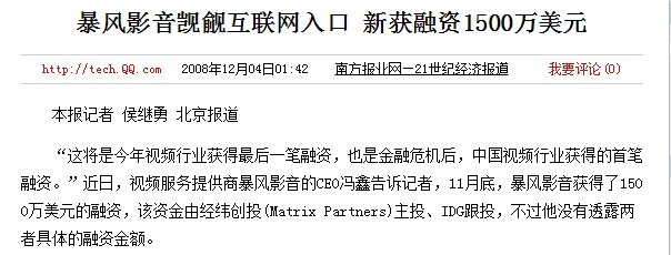圖5:在招股書(shū)financingactivities一欄可以看出,截止到2011年12月31日,YY所有融資金額主要來(lái)自老虎基金的7770萬(wàn)美元。 由圖4也可看出,YY并不止一次虛報(bào)融資額。在2009年,YY稱(chēng)獲2300萬(wàn)融資,但招股書(shū)顯示2009年12月獲C-1輪融資143.9萬(wàn)美元,C-2輪融資1050萬(wàn)美元,共計(jì)1193.9萬(wàn)美元,僅為報(bào)道融資額2300萬(wàn)美元的一半。 四、 狂風(fēng)科技融資金額600萬(wàn)變1500萬(wàn)報(bào)道融資額:1500萬(wàn)美金 真實(shí)融資額:600萬(wàn)美金 創(chuàng)造了40多個(gè)漲停紀(jì)錄的狂風(fēng)科技,在近期股市持續(xù)震蕩大跌之前卻“神奇”停牌,目前股價(jià)還保持高位?耧L(fēng)曾多次謀求登陸美股未果,無(wú)奈拆VIE后回歸海內(nèi),卻成就了“妖股”,但這時(shí)代的幸運(yùn)兒,也有“黑歷史”。 2008年12月,狂風(fēng)影音CEO馮鑫公布前一個(gè)月獲得1500萬(wàn)美元融資,由經(jīng)緯創(chuàng)投主投、IDG跟投,當(dāng)時(shí)的媒體報(bào)道截圖如下: