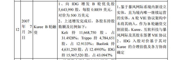 圖6:狂風(fēng)科技招股書(shū)中寫(xiě)到B+輪融資額為600萬(wàn)美元,融資方為IDG資本及經(jīng)緯創(chuàng)投。 2007年4月,狂風(fēng)影音公布獲得600萬(wàn)美元融資,但狂風(fēng)科技招股書(shū)顯示,2007年7月B輪融資為500萬(wàn)美元。