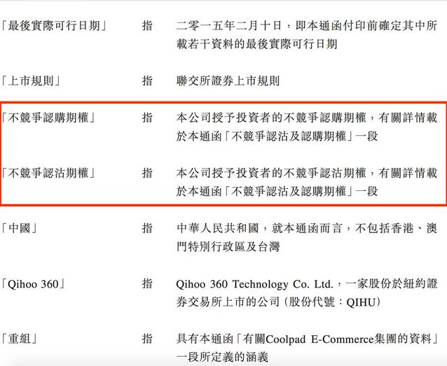 那么360和酷派的“認(rèn)沽權(quán)”是怎么劃定的呢?可以看出,假如雙方劃定了兩種方式“不競(jìng)爭(zhēng)認(rèn)購(gòu)期權(quán)”和“不競(jìng)爭(zhēng)認(rèn)沽期權(quán)”(圖5),并且分別劃定了相應(yīng)的權(quán)利和義務(wù)(圖6-圖8),尤其是圖7,非常具體的劃定了假如違背“不競(jìng)爭(zhēng)認(rèn)沽期權(quán)”的內(nèi)容,即酷派不得直接或間接于中國(guó)或美國(guó)“在與受限制業(yè)務(wù)相同或相似或與之競(jìng)爭(zhēng)的任何業(yè)務(wù)中擁有任何權(quán)益、治理、控制、介入、咨詢、提供服務(wù)或以其他方式從事,或從事協(xié)助”,而眾所周知的是,2015年6月28日,酷派發(fā)布的《控股股東出售股份公告》顯示,郭德英家族通過(guò)信托計(jì)劃持股的Data Dreamland以3.508港元每股的對(duì)價(jià)向樂視聯(lián)系關(guān)系公司出售7.8038億股,占已發(fā)行總股本的18%,后者曾經(jīng)推出了多款手機(jī)產(chǎn)品,與360、酷派合資的奇酷科技的業(yè)務(wù)線重疊嚴(yán)峻,顯然,酷派這是演了一出“一女嫁二夫”的小算盤,但是卻健忘了當(dāng)初與360簽署的協(xié)議,以及必需履行的義務(wù)。