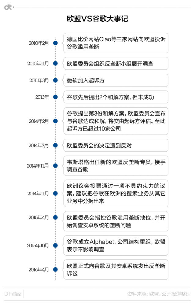 谷歌的反壟斷案,可能即將以30億罰款來終結(jié) 據(jù)英國《逐日電訊報(bào)》報(bào)道,歐盟委員會(huì)近期將公布對(duì)谷歌涉嫌壟斷的罰款數(shù)額,而這一數(shù)字可能高達(dá)破紀(jì)錄的30億歐元。而到目前為止已有的最高反壟斷罰單,是2009年對(duì)芯片制造商英特爾公司11億歐元罰款。 讓谷歌雪上加霜的是,這30億歐元恐怕還不是上限,根據(jù)相關(guān)法律,歐盟委員會(huì)最高可以對(duì)公司處以其年?duì)I業(yè)額10%的罰款。也就是說,谷歌公司面對(duì)的罰款上限將達(dá)60億歐元。 事情大概是這樣的:2010年下半年,幾家搜索及比價(jià)網(wǎng)站指控谷歌利用其搜索上風(fēng)推廣自家服務(wù),損害競爭對(duì)手利益。之后歐盟對(duì)谷歌的反壟斷調(diào)查開始,這一被形容為“史詩級(jí)”的訴訟正式拉開序幕。在之后的近6年的調(diào)查中,谷歌曾先后三次提出和解方案,但終極都被拒絕。 DT君為大家總結(jié)了這場訴訟的歷史: