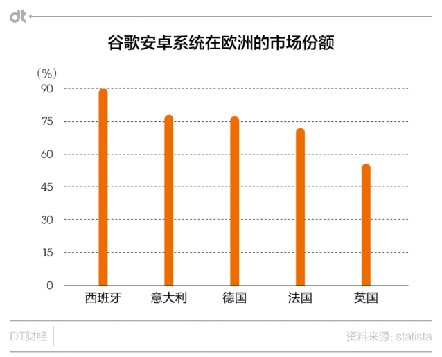 可以看出,歐盟主要針對(duì)的是谷歌預(yù)裝安卓及自己軟件的行為。歐盟以為,谷歌這樣做是在抹殺規(guī)模較小的立異型應(yīng)用制造商和服務(wù)供給商。 實(shí)在,對(duì)于預(yù)裝行為的懲罰,歐盟此前也干過。2007年了解的微軟壟斷案中,歐盟就是認(rèn)定微軟濫用了其在個(gè)人電腦(PC)操縱系統(tǒng)領(lǐng)域的主導(dǎo)地位,向消費(fèi)者強(qiáng)行推廣其媒體播放器,案件的總罰款超過20億歐元。 但此次案件與之不同的是,微軟的預(yù)裝可以直接帶來銷售利潤。而安卓則是免費(fèi)的。那歐盟為何還這么擔(dān)心呢?恐怕是由于谷歌安卓在歐洲的“勢力”其實(shí)太大。 根據(jù)statista的統(tǒng)計(jì),安卓在歐洲各國的市場份額很高,在西班牙甚至達(dá)到了九成。